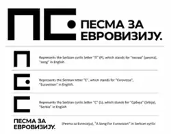 The general slogan is based off the beginning letters of the words "song", "Eurovision" and "Serbia" in Cyrillic, with the name of the contest written next to it.[4]