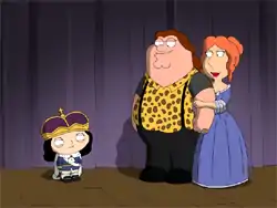 The title is a reference to The Pilgrim's Progress. The episode begins with a cutaway gag featuring Alan Rickman's answering machine. When Madame Claude tells everyone who they were in a past life, she reveals that Quagmire was Jack the Ripper. Also, when Madame Claude first speaks, Peter says that she sounds like Sebastian the crab from Disney's The Little Mermaid[5] King Stewart III orders to kill the cast of How I Met Your Mother after he is displeased with their performance.[6] Griffin Peterson's act in the talent show is a reference to the act the Lambda Lambda Lambdas perform at the homecoming in the 1984 film Revenge of the Nerds.[7] As a running gag throughout the episode, Fox promos appear on the bottom of the screen for made-up shows including Shovin' Buddies, Slowly Rotating Black Man, and Cross-Armed Opposites, parodying stereotypical types of Fox mid-show advertising.[5][6] Griffin Peterson says that he is the happiest guy in the world because he's on his way to get married and there are "290 years separating me from the films of Kevin Smith."[5] A clip is shown of Madonna celebrating her 16th birthday, suggesting she is over 300 years old.[7] During King Stewart's invasion of the settlement the music and lyrics are identical to that of Mel Brooks' Blazing Saddles, with Rock Ridge changed to Quahog. A lady says of King Stewart, "I didn't vote for him," alluding to Monty Python and the Holy Grail. Harry MacAfee from the film Bye Bye Birdie makes an appearance.