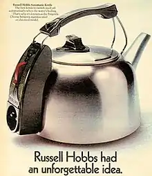 Peter Hobbs and Bill Russell opened their new business in Croydon in October 1952, and later the same year launched the world's first electric coffee percolator, dubbed the CP1.[4] This invention was soon followed by their launch of the K1 electric kettle in 1955. It was the first electric kettle with an automatic shutoff. The K1 was soon superseded by the K2, which had a more attractive appearance.[5] Both versions were expensive, but were built to last. The first K2 Kettles sold for £7, at a time when the average weekly wage was £14, but they became popular as wedding gifts. Russell Hobbs has reports of K2s still operational after 30 years, and although they are now extremely rare, collectors will pay up to £200 for a K2 in mint condition.[6]
