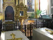 Shortly thereafter, he was transported to Ropsha, where he later died. Much mystery surrounds his death. The official cause, after an autopsy, was a severe attack of hemorrhoidal colic and an apoplectic stroke, while others say he was assassinated. Other accounts state that after a midday meal, Peter's captors tried to suffocate him by using a mattress but he managed to escape. This then led his captors to strangle him to death with a scarf. Nevertheless, he was later buried on 3 August 1762 [O.S. 23 July] in the Alexander Nevsky Monastery, Saint Petersburg.[13][4]