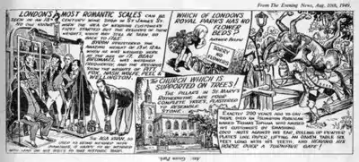 He submitted some sketches to the newspaper unsolicited in 1949 and through a lucky coincidence the paper was looking for an artist to do a strip about London at that time. He was hired and the strip become a success, giving rise to books of compilations of his work.[1] The London Is Stranger Than Fiction strip ran every Wednesday in the London Evening News newspaper. The strip featured quirky and little known historical facts about London in an easy to read illustrated cartoon strip. The strip ran continuously from 1949 until the paper closed for good in 1980.[2]