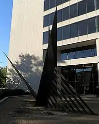 Massachusetts native and artist John Raimondi’s sculpture, Peter John, is an abstract piece that consists of three triangular forms located in Milwaukee’s downtown. The three triangular forms meet at a central point near the base of the sculpture and jut out from one another as the sculpture is viewed from bottom to top. The sculpture was commissioned in tribute to John Raimondi’s father. A Blue Cross Blue Shield customer, John Whipperfield, commissioned the project from a donation. The total cost of the project was $200,000. This donation led to the groundbreaking of the project in 1978. [1] The plaque on site reads: PETER JOHN/Cor-Ten steel/John Raimondi, Sculptor/Bequest from John Whipperfield/Subscriber to Blue Cross of Wisconsin/and Surgical Care - Blue Shield/June 1978.[1]