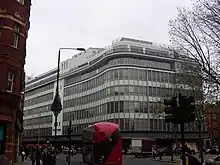 The present building, which occupies an entire island site on the west side of Sloane Square, was built between 1932 and 1936 to designs by William Crabtree of the firm of Slater, Crabtree and Moberly.[2] The building is the first modern-movement use of the glass curtain wall in Britain (not, as is often claimed, the first per se, as late-Victorian examples in the Gothic Revival style exist) and is now a Grade II* listed building.