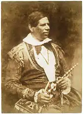 Jones travelled to Great Britain in 1845 for a third fundraising tour, giving speeches and sermons. Wherever he travelled, Jones drew huge crowds, but inwardly he was depressed. He felt the crowds were only there to see the exotic Indian Kahkewāquonāby and his native costume, and did not appreciate all the work he had put into becoming a good Christian. Despite his misgivings about the trip, he raised £1000, about two thirds of that total in Scotland, and one third in England.[67] On August 4, 1845, in Edinburgh Jones was photographed by Robert Adamson and David Octavius Hill. These were the first photographs taken of a North American Indian.[34][66]