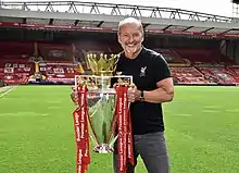 Moore left EA and was announced as the new CEO of the Liverpool Football Club on 27 February 2017. Moore took up his new role, which comprises running the business of the club, on 1 June 2017 and reported directly to the club's owners, Fenway Sports Group.[24][25] Moore stepped down as CEO at the end of August 2020 with Billy Hogan stepping up from his role as the club's managing director and chief commercial officer.[26] During his tenure with the club, they won the UEFA Champions League, the FIFA Club World Cup and the Premier League. Moore was also named Premier League CEO of the Year in 2019. Moore created and funded the Peter Moore Foundation while in Liverpool, supporting such causes and institutions as social isolation, food poverty, cancer research and Alder Hey Hospital and the new Clatterbridge Cancer Centre in Liverpool. He, with his wife Debbie, were named honorary Life Presidents of Fans Supporting Foodbanks, a volunteer organisation that collects food for those in need at football matches and various local events.