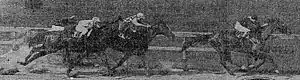In 1907, Peter Pan won six of his nine starts with two seconds, one of which was in the spring in the Withers Stakes. As the prestigious U.S. Triple Crown of Thoroughbred Racing had not at that time been established, the 3-year-old Peter Pan was not entered in the Kentucky Derby or the Preakness Stakes. However, he won the then 1⅜ miles Belmont Stakes, a race that is now the third leg of the Triple Crown series. In winning the Belmont, he defeated Frank Gill who had beaten him in the Withers Stakes. In 1907, Peter Pan also won the important Brooklyn Derby, the Standard Stakes at Gravesend Race Track, as well as the Advance and the Tidal Stakes at Sheepshead Bay Race Track. Shortly after winning the Brighton Handicap he suffered a tendon injury and was retired to stallion duty at his owner's Castelton Stud. In a review of Peter Pan's win in the 1907 Brighton Handicap in front of 40,000 fans, the New York Telegraph was quoted as saying the horse "accomplished a task that completely overshadowed any previous 3-year-old performance in turf history." [1]