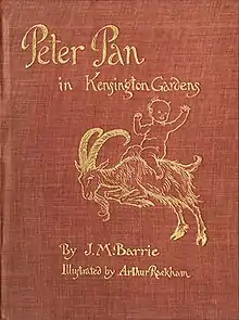 Most of the text of Peter Pan in Kensington Gardens was included as chapters 13–18 of Barrie's earlier novel The Little White Bird, published in 1902, with minor differences appearing on only nine pages of the separately published 1906 novel.[1] The Little White Bird was published as a novel for adult readers; whereas Peter Pan in Kensington Gardens was published specifically as a children's book.[2] Scholar Jacqueline Rose perceives, however, that the book is not so much a children's book as one for art collectors thanks to the 1906 edition's illustrations by Arthur Rackham.[3]