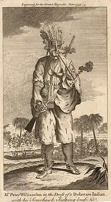 Peter Williamson (1730 – 19 January 1799), also known as "Indian Peter", was a Scottish memoirist who was part-showman, part-entrepreneur and inventor. Born in a croft in Aberdeenshire, he was forcibly taken to North America at an early age, but succeeded in returning to Scotland where he eventually became a well-known character in 18th century Edinburgh. He adopted the pseudonym "Indian Peter" due to his time spent with native Americans and his self-exploitation of this in an autobiography and by touring Scotland and England in the guise of a "Red Indian".