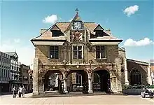 Housing and sanitary improvements were effected under the provisions of an Act of Parliament passed in 1790; and an Act was passed in 1839 to build a gaol to replace the two that previously stood.[8] After the dissolution the dean and chapter, succeeded the abbot as lords of the manor. The municipal borough was incorporated in 1874 under the government of a mayor, six aldermen and eighteen councillors.[17] Among the privileges claimed by the abbot as early as the 13th century was that of having a prison for felons taken in the Soke of Peterborough. In 1576 Bishop Edmund Scambler sold the lordship of the hundred of Nassaburgh, which was coextensive with the Soke, to Queen Elizabeth I, who gave it to Lord Burghley, and from that time until the 19th century he and his descendants, the Earls and Marquesses of Exeter, had a separate gaol for prisoners arrested in the Soke.[13] The abbot formerly held four fairs, of which two, St. Peter's Fair, granted in 1189 and later held on the second Tuesday and Wednesday in July, and the Brigge Fair, granted in 1439 and later held on the first Tuesday, Wednesday and Thursday in October, were purchased by the corporation from the Ecclesiastical Commissioners in 1876. The Bridge Fair, as it is now known, granted to the abbey by King Henry VI, survives.[18] Prayers for the opening of the fair were once said at the morning service in the cathedral, followed by a civic proclamation and a sausage lunch at the town hall which still takes place. The mayor traditionally leads a procession from the town hall to the fair where the proclamation is read, asking all persons to "behave soberly and civilly, and to pay their just dues and demands according to the laws of the realm and the rights of the City of Peterborough".[19]