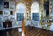 The East and West Chinese Cabinets were decorated between 1766 and 1769 to exhibit objects of decorative art imported from the East. The walls were decorated with imitation Oriental patterns by Russian craftsmen, and hung with Chinese landscape paintings in yellow and black lacquer. Another room, positioned at the centre of the palace, bears the name of the Picture Hall. Its walls are almost entirely covered by a series of 368 paintings, mostly of variously dressed women, differing in appearance and even age, yet most were drawn from a single model. These were purchased in 1764 from the widow of the Italian artist P. Rotari, who died in St. Petersburg.