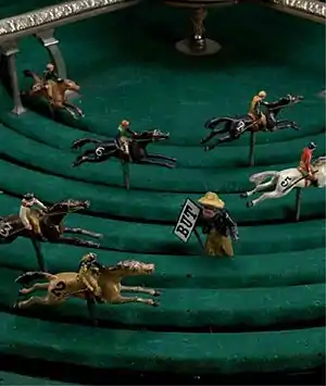 Petits-Chevaux, French for "little horses", is a gambling game played with a mechanical device consisting of a board perforated with a number of concentric circular slits, in which revolve, each independently on their own axis, figures of jockeys on horseback, distinguished by numbers or colors. The bystanders having staked their money according to their choice on a board marked in divisions for this purpose, the horses are started revolving rapidly together by means of mechanism attached to the board, and the horse which stops nearest a marked goal wins, every player who has staked on that horse receiving so many times his stake. Figures of railway trains and other objects sometimes take the place of horses. In recent years there has been a tendency to supplant the petits chevaux at French resorts by the boule or ball game, on the same principle of gambling; in this a ball is rolled on a basin-shaped table so that it may eventually settle in one of a number of shallow cups, each marked with a figure.