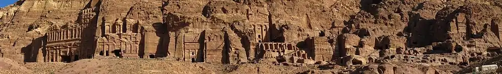 ![]() ![]() ![]() ![]() ![]() From top left to right: the Urn Tombs, en-Nejr theatre, Al-Khazneh (Treasury), Qasr al-Bint temple and view of Ad Deir (Monastery) trail. | |