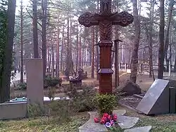 ![]() A traditional cross at Petrašiūnai Cemetery (Grave of Bernardas Brazdžionis) | |