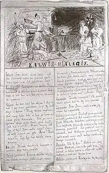 While a student in Saint Petersburg, Vileišis was a member of an informal group of Lithuanian students that used to gather in the apartments of graf Vladimir Zubov.[32] Vileišis and the group established the Lithuanian-language newsletter Kalvis melagis (Smith the Liar) in violation of the Lithuanian press ban. It was a primitive 4-page publication – handwritten and then mimeographed in secret.[33] While only about ten issues appeared between December 1875 and March 1876, it was the first known Lithuanian periodical published in the Russian Empire.[34]
