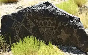 The basalt rocks' geologic nature allows for the creation of the petroglyphs, or rock carvings, on their surface. The rocks contain high concentrations of iron, manganese and calcium; this combination creates rocks of a gray-like color. However, over thousands of years of exposure to the desert's rough environment, a "desert varnish" forms on the surface. The varnish is formed from the oxidization, or rusting, of the manganese and iron when mixed with oxygen in the air and water from rain; this varnish is dark, almost-black and glossy in appearance. Long ago, Native Americans, as well as Spanish settlers discovered that images can be created on the faces of the rocks by chipping away at this layer using rocks and other tools.[7]