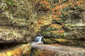Pewit's Nest State Natural Area is a nature reserve in Wisconsin, USA, that includes a deep gorge formed during the retreat of the last glacier. Pewit's Nest is outside Baraboo in Sauk County. At one time a waterwheel and mill were located on the site and an individual lived in the solid sandstone. The name of the site was a result of early settlers calling it "Peewit's Nest" after the abode, ten feet above a deep pool of water, resembling the nest of a phoebe (or peewit, an earlier name for this bird). The water-wheel once turned lathes for repairing or manufacturing equipment, but no evidence of it remains. Pewit's Nest is owned by the Wisconsin Department of Natural Resources and was designated a State Natural Area in 1985.