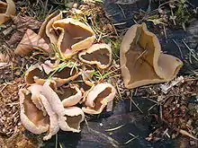 Peziza varia can be identified by its growth on rotted wood or wood chips, its brown upper surface (at maturity) that is usually somewhat wrinkled near the center; a whitish and minutely fuzzy under surface; a round, cuplike shape when young, and a flattened-irregular shape when mature; attachment to the wood under the center of the mushroom, rather than under the whole cup; thin, brittle flesh (rather than thick and gelatinous) and smooth, elliptical spores that lack oil droplets.[1]