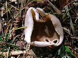 The cup at first is pale brown or whitish overall, the under surface minutely fuzzy and the upper surface smoother, with a tiny stem-like structure. In maturity it is flattened-irregular or bent backwards, 2–12 cm across,[2] the margin often splitting, upper surface brown and smooth, often "pinched" or somewhat wrinkled over the center, under surface whitish and minutely fuzzy, attached to the substrate centrally, without a stem. It has no odor. The flesh is brownish or pale, and brittle.[1]