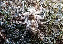The whole body of Phaeacius is 7.5 to 11.5 millimetres (0.30 to 0.45 in) long, and notably flattened, including the carapace,[1] while the carapaces of some other groups are raised.[2]: 495 [1] The cephalothorax of Phaeacius′ is relatively long, and the highest point is a little behind the last pair of eyes.[3]: 204, 206-208 Phaeacius is very well camouflaged;[1] for example, P. malayensis has a body with dull grey and brown markings that resemble the surface of tree trunks in the rainforest.[4][5]