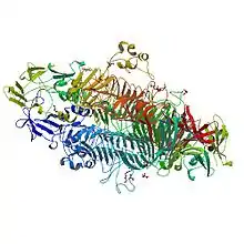 P22TSP is a homotrimeric structural protein consisting of 666 amino acids. It is noncovalently bound to the neck of the viral capsid. It has been crystallized in space group P213 and has one monomer in the asymmetric unit. The secondary structure of P22TSP is dominated by a parallel Beta helix comprising 13 complete turns.[11] This structure is further characterized as a beta-solenoid domain.