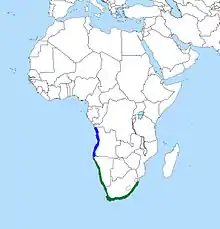 It breeds from Namibia south to southern Western Cape. In the nonbreeding season, it may be found as far north as the mouth of the Congo, and also extends up the east coast of South Africa as far as Mozambique. In the 1970s, the breeding population was estimated as over 1 million in Namibia alone. However, the IUCN now classifies it as "Endangered" due to a very rapid decline in the population over the last three generations.[1]