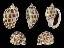 The size of an adult shell varies between 35 mm and 130 mm.[3] These medium-sized shells are oval and acuminate, with a rather narrow mouth, the outer lip folded back and internally denticulate. Shoulder are not angulate nor plicate and the anterior prickles on outer lip obsolete. The surface of the shell is white with five series of large squarish red-brown spots (hence the common name). Later whorls show spiral striae anteriorly on whorls and above shoulders.[5][6]