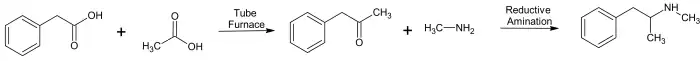In the TV series Breaking Bad, Walter White manufactures methamphetamine using phenylacetone and methylamine through a reductive amination reaction. White produced phenylacetone in a tube furnace using phenylacetic acid and acetic acid.