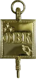 The "key" of Phi Beta Kappa did not begin as a copy of a watchkey. The first insignia was in fact a larger, cut-and-engraved silver medallion, essentially a square of metal with a loop cut integrally with the body of the square from the same sheet of silver, in order to allow for suspension from one or two ribbons worn around the member's neck in the manner in which the older fraternities (and the Masonic bodies on which the collegiate societies were in part patterned) wore their own insignia.[21] Later, the size of the medallion was reduced and men took to wearing the insignia on their watch chains as fobs.