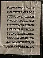 Among her many posts regarding concerns with school shootings and gun control, she expressed that she felt a "responsibility to the children of the world".[110] By April 2021, Madonna had invited her audience to join the campaign of Everytown for Gun Safety,[111] and she was later seen posting wheat paste stickers with messages about gun control on Los Angeles streets. Various people noted her efforts, including actor Peter Stickles.[112] In May 2022, she shared a lengthy post after the Texas shooting at the Robb Elementary School demanding a "Gun Reform" from lawmakers, calling out to the National Rifle Association.[113][114]