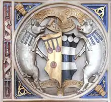 ![]() Arms of Sir Philip Courtenay: Courtenay impaling Hungerford with supporters two Courtenay boars. In the spandrels are the heraldic badges of Hungerford: three conjoined sickles and the Peverell garbs. Detail from Bishop Peter Courtenay's Mantelpiece, erected by Sir Philip's son Bishop Peter Courtenay (died 1492), Bishop's Palace, Exeter.[1] | |