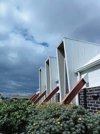 After building the Wedge House in 1999, Harmer Architecture received both the Commendation for Outstanding Architecture award from the RAIA and the Winner Wools of New Zealand award from Interior Design Awards.[4] Wedge House is one of Melbourne's narrowest buildings with only 1.8 meters in width and 16 meters in length. The major materials used were concrete and rubber, but stainless steel linings and ionized copper sheets were also used for the main entrance door and windows. Rollo mentioned that "The two-storey house responds to the shape of the wedge in both plan and elevation [and] its design almost reflects seamlessly to a streetscape of two-storey and single-storey Victorian homes and buildings."[8]