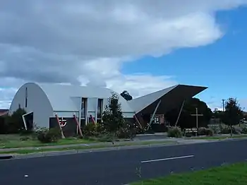 In 1993, Harmer won his second RAIA award with the development of the monumental Altona Meadows/Laverton Uniting Church.[4] The design of the building was inspired from an aircraft hangar because of the recognition of the aviation industry in Melbourne.[6] The six curve-shaped iron pieces supports the main part of the building in which, "The curved roof form has been chosen for functional and economic reasons [where] the principal worship space is located centrally under the highest part of the roof with the secondary spaces grouped at each end..."[6] There are also movable walls inside the building, which can create more open or closed spaces. According to Goad, Harmer's choice of using bold shapes, strong colors and graphic structural expressions allows one to travel back to the structural-functional era when churches reflected postwar liturgical advances.[6][7]