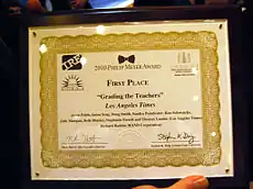 | 2010[6] | Los Angeles Times | 'Grading the Teachers' | A first-rate example of strong watchdog story-telling combined with innovative use of social science methods. Indeed, the point of the project was the failure of Los Angeles school officials to use effective methods to measure the performance of classroom teachers. The Los Angeles Times, applying a method called gain-score analysis to a huge database of individual students’ test scores and their teachers, identified the most and least effective teachers based on how much the students’ scores improved. The Times hired a national expert in gain-score analysis to do the data crunching, adding credibility to the results, but also did additional statistical analysis to identify high- and low-performing schools and otherwise verify their findings. In identifying and rating 6,000 teachers by name, the Times outraged the teachers’ union, but the series has prompted district officials to begin negotiating with the union to use the gain-score method in evaluations. Another sign of the impact of this series is that newspapers across the country have begun requesting similar data from local school districts. |