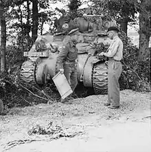 In June 1943, Roberts handed over the 26th Armoured Brigade to Brigadier Richard Hull and was posted back to the United Kingdom, where for six months he commanded the 30th Armoured Brigade, part of Major-General Percy Hobart's 79th Armoured Division.[11] The 79th Armoured was not a typical division as it had recently been reorganised to control all the specialised armour in the Anglo-Canadian 21st Army Group and was more popularly known as Hobart's Funnies. Roberts's brigade was soon equipped with Sherman Crab tanks with mounted flails for the purpose of clearing mines, and he himself was able to observe the capabilities of the armoured fighting vehicles which would later assist him in future operations.[11]