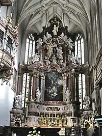 His most notable works include the altars (1730) (now destroyed) in the Parish Church of the Holy Blood in Graz; the statue of St. John Nepomuk (1734) in front of the pilgrimage church in Weiz; the images of St. John Nepomuk and St. Aloysius (1744–1745) on the altars in the Cathedral of St. Ägydius in Graz; four statues (1764) in front of Schloss Eggenberg in Graz; the high altar and two side altars in the parish church at Ebersdorf (1766); and the figures of St. Michael and two other angels (1769) on the pediment of façade of the Maria-Hilf-Kirche in Graz.[1][2]