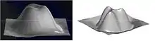 An image of benzene by tunneling microscopy: on the left, the experimental image; on the right, the calculated image.