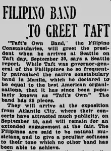After its inaugural engagement, the band remained in the mainland United States for several months, performing at other public events. A concert at the New York Hippodrome met with a "rousing reception" in which "encore after encore" was demanded, the band finally concluding with the overture from Tannhäuser followed by the Stars and Stripes Forever.[1] On April 17, 1909, the band returned to Washington at the request of Helen Taft to perform at the opening of West Potomac Park.[10] Later, it appeared in Seattle at the Alaska-Yukon-Pacific Exposition to herald the arrival of President Taft for his inspection of the fairgrounds. The band then traveled to San Francisco, California, to depart for the return voyage to the Philippines. As their troopship was departing, Taft ordered his own vessel to pull alongside. Seeing the president's ship approach, the band struck up Hail to the Chief prompting Taft to shout back "goodbye, boys – I wish you a pleasant voyage!"[11]