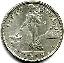The Philippine fifty-centavo coin (Filipino: limampung sentimo) (50¢) was a denomination of Philippine currency. It was minted for the Philippines from 1864[1] to 1994 and was demonetized in 1998.