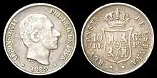 The first coin worth one tenth of a peso was the 10 centimo coin of 1864-1888 issued under Queen Isabel II of Spain, followed by 10 centimos of 1880-1885 issued under King Alfonso XII. The latter obverse was inscribed 'Alfonso XII por La G(racia) de Dios' (Alfonso XII, by the Grace of God) and the year of minting. The reverse featured the coat of arms of Castille and Kingdom of León. Around it was the inscription 'Rey de Espana' (King of Spain) and the denomination as 10 Cs. de Po. (10 centimos of peso).[1]