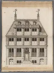 Vingboons started his career as a painter in the family business with his father and siblings, where he was educated with cartography, mathematics, architecture, and classics. He later became an architect, and he was possibly a student of the architect Jacob van Campen.[2] He became engaged to Petronella Questiés on 21 April 1645, when he was 37 years old.[1] He had a set of his designs engraved by his brother Jan in 1648 for the Amsterdam council, and Justus Danckerts published these in 1688.[4] Thanks to this book, much of his work can be attributed accurately, including some designs that were not executed, such as his maquette for the Amsterdam city hall, and the buitenplaats Vredenburch in Beemster. Vingboons died in 1678[2] and was buried on 10 February 1678 in Amsterdam.[1]