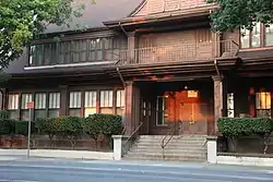 In 1982, the membership wished to retain control over its building so it voted not to be included in Stockton's Magnolia Historical District. Following the Philomathean Club's decision, there were several break-ins at the clubhouse. At the same time, maintenance costs grew and membership diminished.[7] In 2000, the City of Stockton purchased the building for $25,000 with the intention of using it to host public events.[9] Due to the city's bankruptcy dealings in 2013, creditors pressed them to put for sale many historic properties, including the Philomathean Clubhouse. However, the terms of the city's deal with the club was that a new owner must allow the club to use the building on the condition the club maintains at least 10 members.[6] Soon after the city removed the clubhouse from the list of properties for sale.[9] In 2015 it was sold to a newly formed foundation named the Philomathean Foundation, whose goal was to make improvements to the building and use it for public events. The price of the sale was $28,500 despite a valuation of $400,000. At the time, the building was in such disrepair that city documents estimated it needed over $540,000 in renovations, the majority of the cost relating to the roofing.[9]