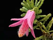 Philotheca coccinea is an erect or spreading shrub that grows to a height of 0.3–1.5 m (1 ft 0 in – 4 ft 11 in) and has branchlets covered with warty glands. The leaves are clup-shaped, about 10 mm (0.39 in) long and 1.5 mm (0.059 in) wide, smooth on the upper surface but with prominent warty glands on the lower side. The flowers are borne singly in leaf axils on a drooping pedicel 6–8 mm (0.24–0.31 in) long. There are five fleshy, broadly egg-shaped sepals about 1.5 mm (0.059 in) long. The five petals are red to pink, rarely white, about 8 mm (0.31 in) long and joined in their lower half. The ten stamens are free from each other and densely woolly-hairy.[2][3]