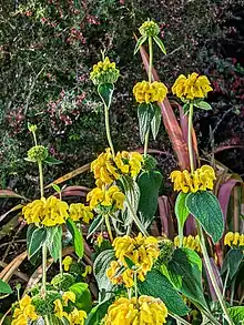 Phlomis russeliana, Turkish sage, is a species of flowering plant in the family Lamiaceae, native to Turkey and Syria in south west Asia. It is often confused with the closely related P. samia,[2] and wrongly marketed as Phlomis viscosa.[3] Growing to 1 m (3.3 ft) tall, it is a herbaceous perennial with hairy, erect stems. The textured, grey-green, sage-like leaves are arrow shaped, and point downwards. In summer, whorls of green buds develop in the leaf axils at regular intervals up each vertical stem, giving a distinctive tiered effect. The buds open to globose clusters of dull yellow hooded flowers.[4]