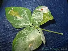 The larvae feed on Carissa carandas, Caesalpinia pulcherrima, Diospora deltoidea, Cajanus cajan, Calopogonium mucunoides, Canavalia species (including Canavalia ensiformis), Centrosema pubescens, Crotalaria juncea, Dolichos lablab, Dumauis bicolor, Glycine max, Lablab purpureus, Macroptilium atropurpureum ,[4] Macroptilum lathyroides, Phaseolus mungo, Phaseolus semierectus, Phaseolus vulgaris, Pueraria phaseoloides, Vicia faba, Vigna catjang, Vigna marina, Vigna marina, Vigna mungo, Vigna radiata, Vigna umbellata, Vigna unguiculata, Cissampelos pereira, Cyclea species, Stephania hermandifolia, Stephania japonica, Tinospora cardifolia and Coffea species. They mine the leaves of their host plant.