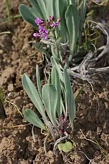 The species is a perennial herb producing one or more stems up to 25 to 30 centimetres (9+7⁄8 to 11+3⁄4 in) tall from a caudex. The basal leaves are narrowly lance-shaped to teardrop-shaped, up to 10 cm long, and woolly in texture. Leaves higher on the stem are shorter and usually less hairy. The inflorescence is a raceme of flowers[3] with purple or pink petals up to about 1.5 cm long.[1] The fruits are narrow, hairless siliques up to 9 cm long,[3] and stick out from the stem on pedicels.[2]