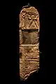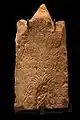 Most of the inscriptions include a general dedication (the ʾŠ NDR part), but a minority of them include a certain specific vowed object(s): obelisks and masks,[4] copper altar,[5] wooden cart/carts/female calf,[6] et cetera. Some of the inscriptions describe the stele of the vowed object as a gift, mostly in the version ʾŠ YTN ("which gave", as opposed to ʾŠ NDR) or with MTNT ("gift"),[7][8][9][10][11][12][13] and some mix both the gift and the vow versions.[14] Some inscriptions are made in an extremely short formula, including only the vower's name and the word NDR (as an noun – "the vow of")[15] or MTNT ("the gift of").[16] The closing statement rarely appears as "for he/she/they heared the voice of his words".[17] There are also some exceptions in the order of the parts of the standard formula.[18] A few inscriptions worn a potential thief that Tinnit or Baal Hammon, to whom the stelae were dedicated, will punish him.[19]