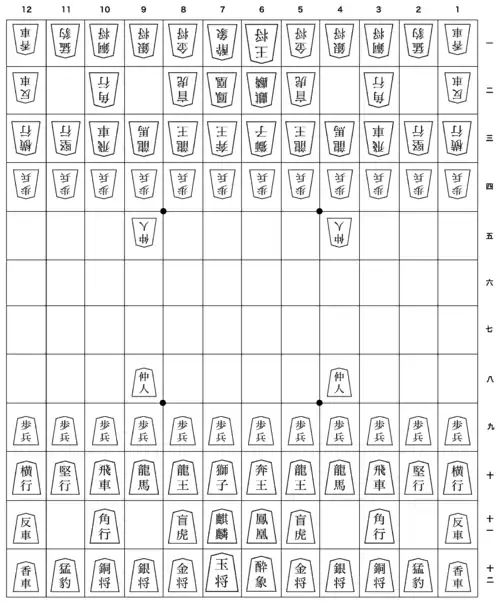 Two players, Black and White (or 先手 sente and 後手 gote), play on a board ruled into a grid of 12 ranks (rows) and 12 files (columns), with a total of 144 squares. The squares are undifferentiated by marking or color, unlike a Western chess board.