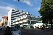 A residential and commercial building, Asunto Oy Salamankulma, was built on the site and was completed in 1961.[1] Salamankulma was designed by architects Matti Hakala and Aarne Nuortila and assisted by Sakari Kauria, an architecture student. The building has two parts: a low three-story business wing and a ten-story residential building behind it.[6] Insurance companies Pohjola and Suomi-Salama have been operating in the low-rise since 1977.[1]