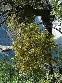 This mistletoe is a parasitic plant on host trees, especially oak species, and other trees and woody shrubs such as manzanitas, California bay laurel, and sumac.