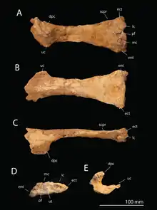 The last vertebra is the C9 according to Pereda-Suberbiola and colleagues (Kellner's C8,[10] which is visible in hind view, and its preserved part is 75 mm (3.0 in) high. Its neural arch has a large neural spine and well-developed transverse processes (which projected from the sides of the centrum and acted as attachment points for muscles and ligaments). The neural spine terminates in a blunt process above, and the hind side of the neural spine has an oval depression, which has thick vertical edges at its sides. The transverse processes are long and slender, and project to the sides and slightly downwards. The neural canal is small and nearly circular, is about 22 mm (0.87 in) in diameter, and there are no pneumatic foramina near it. Its condyle is broad, around five times wider than high, and is crescent-shaped in cross-section. The left postexapophysis is placed at the side of the condyle and almost vertical. Though none of the vertebrae preserve cervical ribs, the development of the transverse processes of the last vertebra indicates that it probably had ribs.[1] The indeterminate bone fragment associated with the two last vertebrae has a similar texture to them, is flat and crescent-shaped, and is about 9 mm (0.35 in) wide and 44 mm (1.7 in) long.[1]